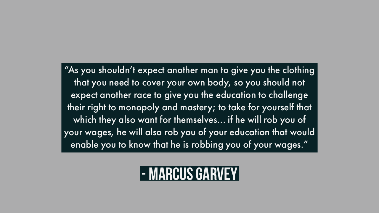 “As you shouldn’t expect another man to give you the clothing that you need to cover your own body, so you should not expect another race to give you the education to challenge their right to monopoly and mastery; to take for yourself that which they also want for themselves… if he will rob you of your wages, he will also rob you of your education that would enable you to know that he is robbing you of your wages.” – Marcus Garvey