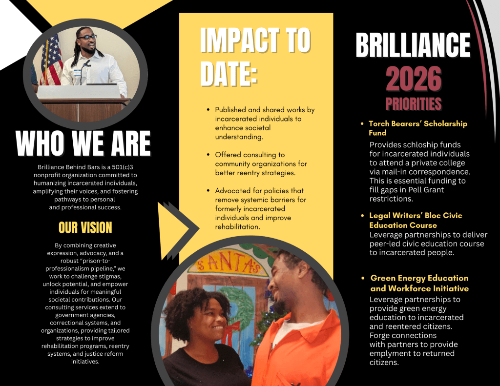 Your support helps Brilliance Behind Bars drive systemic change, humanize the incarcerated, and create a transformative system for rehabilitation and opportunity. Together, we can empower brilliance behind the bars and beyond, shaping futures defined by second chances and meaningful contributions– Donate Today