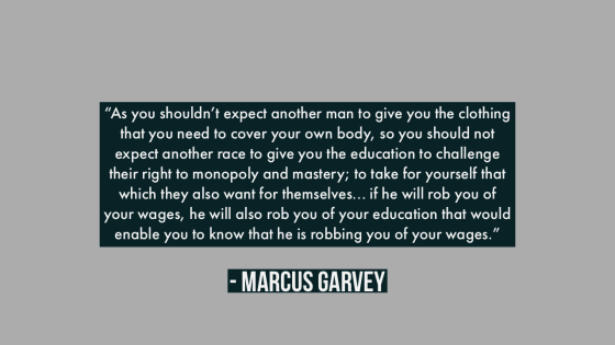 “As you shouldn’t expect another man to give you the clothing that you need to cover your own body, so you should not expect another race to give you the education to challenge their right to monopoly and mastery; to take for yourself that which they also want for themselves… if he will rob you of your wages, he will also rob you of your education that would enable you to know that he is robbing you of your wages.” – Marcus Garvey